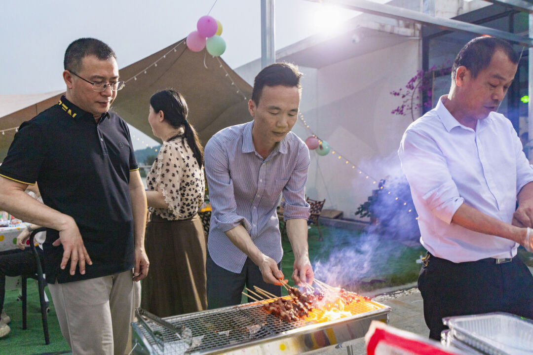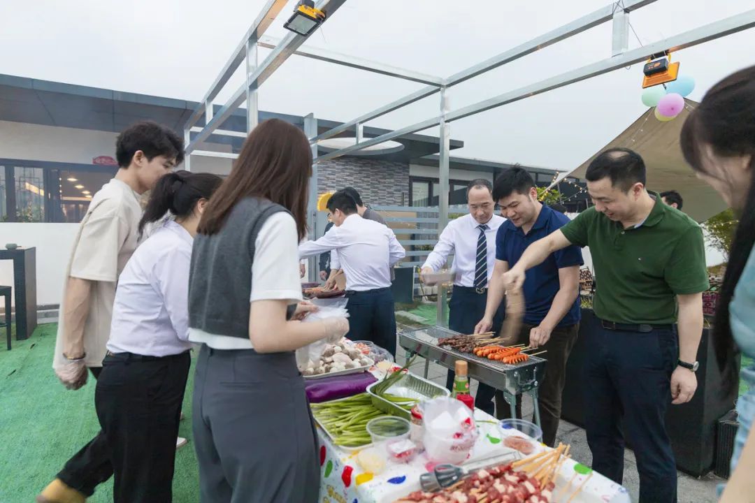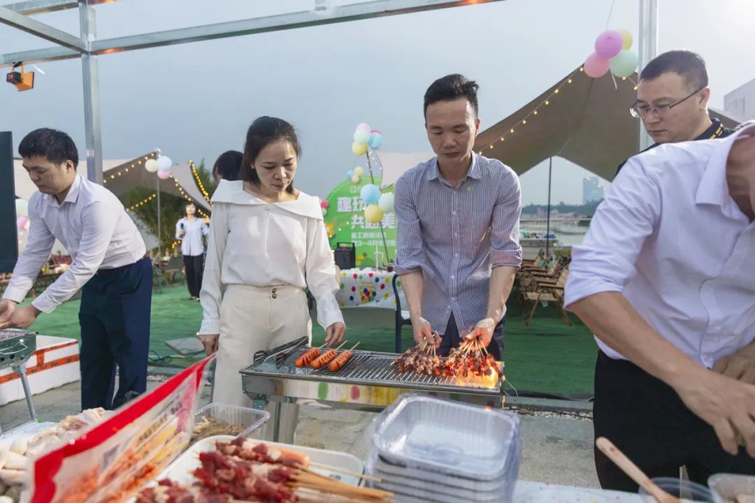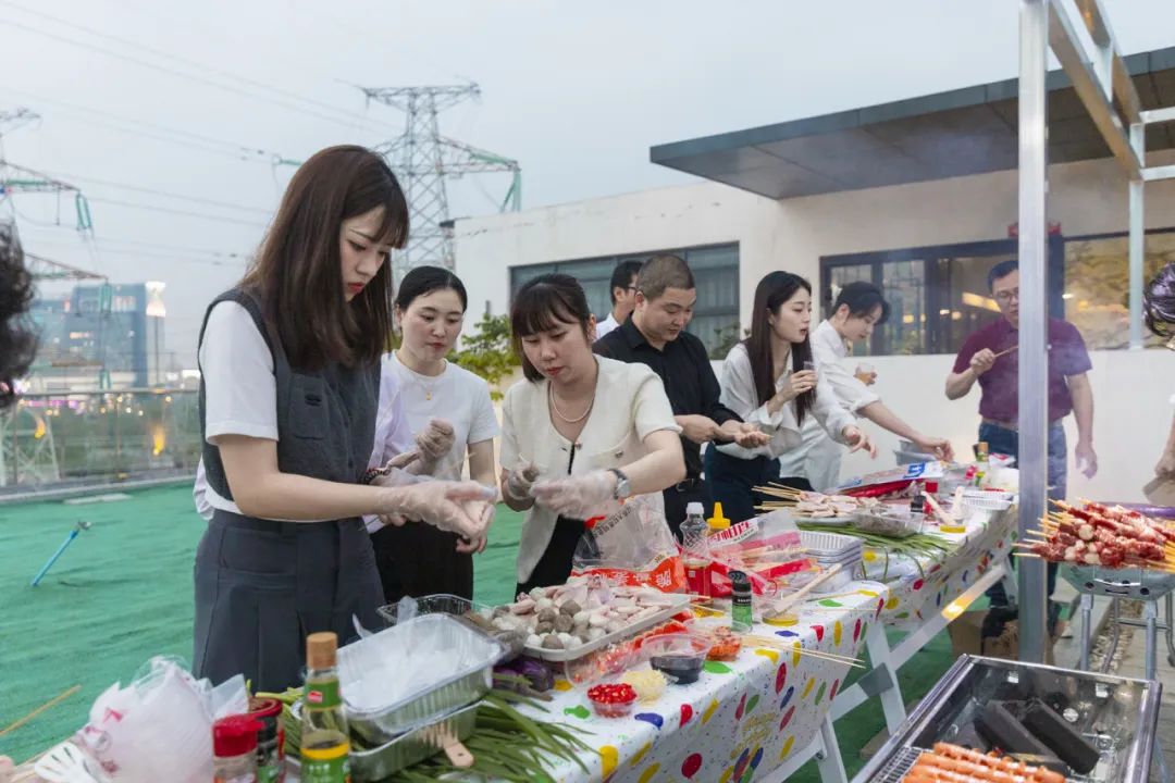 在这浪漫的天台来一场美味的烧烤约会再适合不过,人力行政中心准备了烧烤食材供大家自行烤制。家人们纷纷熟练地拿起食材和工具施展起了厨艺,一边烧烤一边畅聊,增进彼此感情,在这美景和美食中放松身心。
