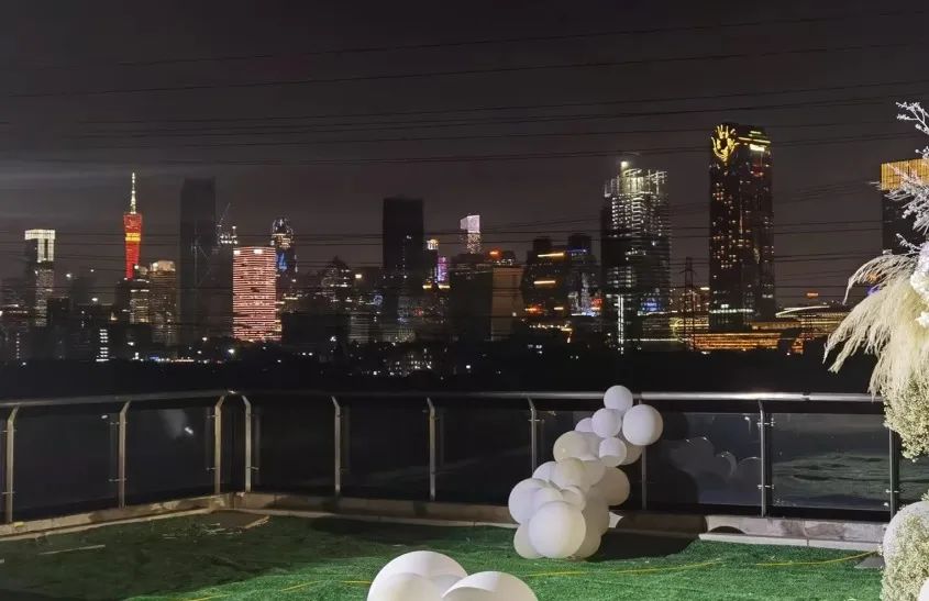 乐天智谷的空中花园,360度无遮挡视野,眺望广州塔,再加上精心布置,把现场的氛围感拉满。