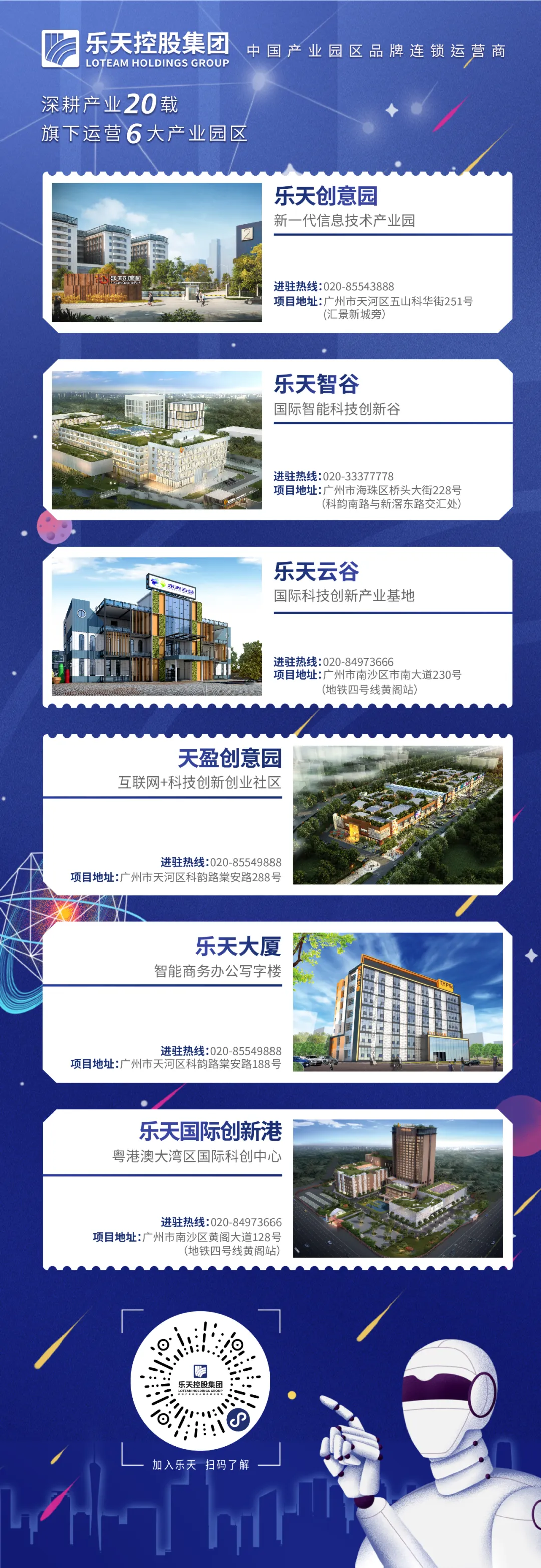 乐天控股集团创立于2004年,经过20年的发展,独立运营管理的产业园区及商业体总建筑面积约50.8万平方米,已发展成为以城市更新建设与改造、产业园区运营、产业创新孵化服务和产业创业投资为核心的产业园区品牌连锁运营商。乐天以“绿色低碳办公、产业高度聚焦、功能配套完善”为园区建设理念,通过智慧园区管理手段、搭建六位一体产业服务平台,提供企业全生命周期服务,为企业高质量发展、城市产业转型升级赋能,助推区域的经济发展。