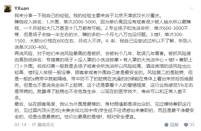 这个哥们能说得这么详细,很大可能是资深玩家,以他的推算,这行业的收入真的非常离谱,即便是价格最低的从业人员。