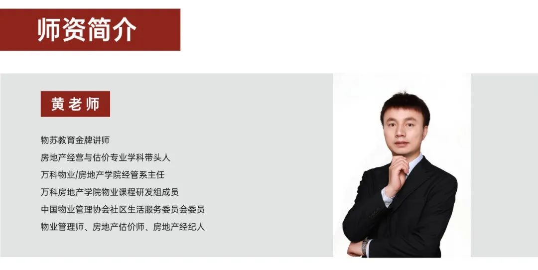 黄老师在万科物业、世联地产、洪泽集团等房企12年管理工作经验,300+企业培训经历;参与编写了《房地产估价理论与实务》、《物业经营管理》、《物业综合管理服务》等书籍;从事物业管理课题研究10余项。