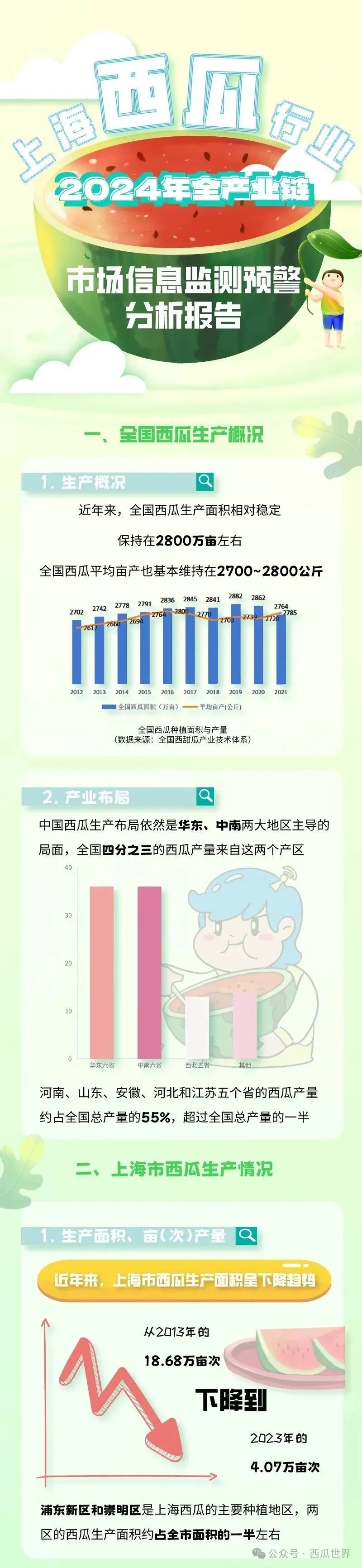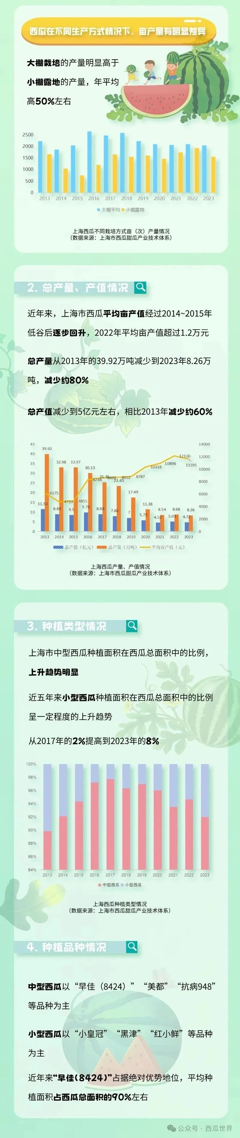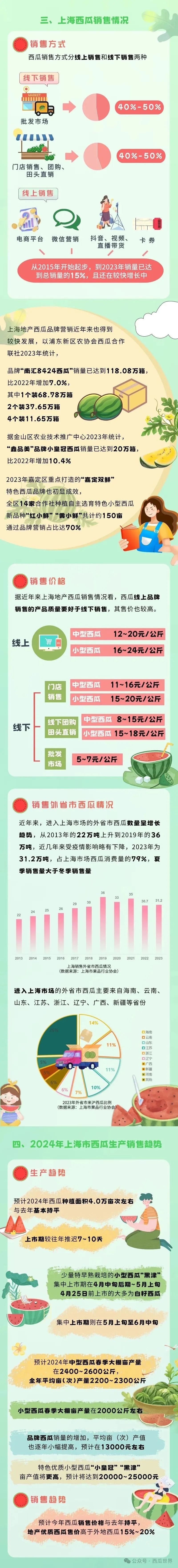 四季更替,应季而食,转眼间又要到上海地产西瓜上市的时节。那么,地产西瓜产量如何?种在哪个区?有哪些品种?销售价格怎么样?市农业农村委介绍,日前,上海市农产品(瓜果)全产业链市场信息监测预警分析团队公布了《上海市西瓜行业2024年全产业链市场信息监测预警分析报告》,一起来看下吧↓