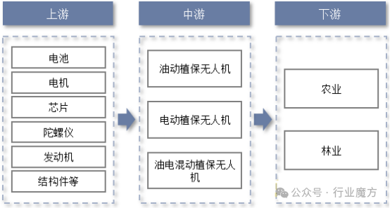 植保无人机行业产业链上游主要包括电池、电机、芯片、陀螺仪、发动机、结构件等零部件;中游为植保无人机生产供应环节;下游主要应用于农业及林业种植领域。