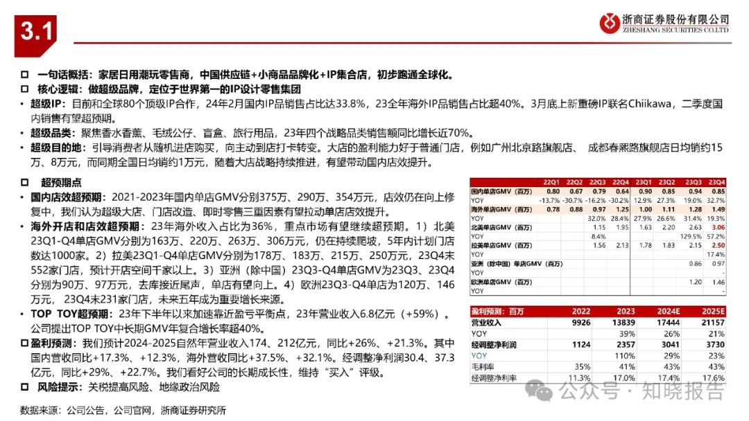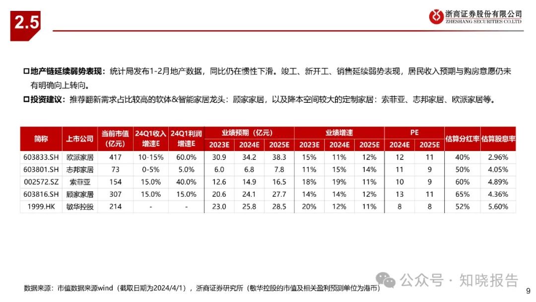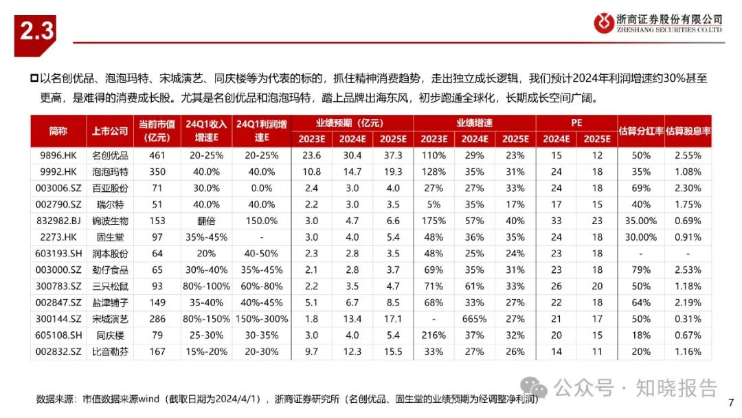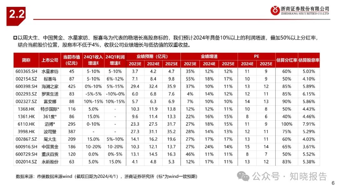 以周大生、中国黄金、水星家纺、报喜鸟为代表的稳增长高股息标的,我们预计2024年具备10%以上的利润增速,叠加50%以上分红率,结合当前股价位置,股息率不低于4%,收获公司业绩增长与低估值的双重收益。