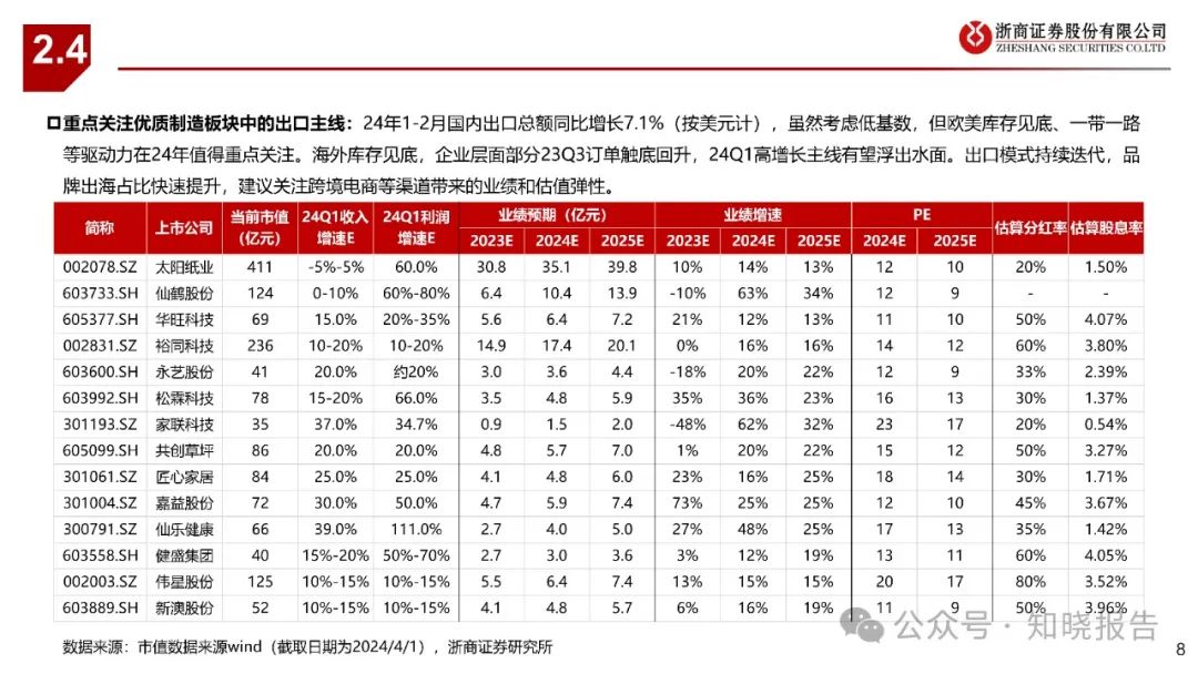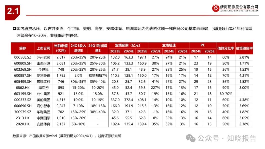 国内消费承压,以古井贡酒、今世缘、美的、海尔、安踏体育、申洲国际为代表的优质一线白马公司基本面稳健,我们预计2024年利润增速普遍在10-30%,业绩确定性较强。