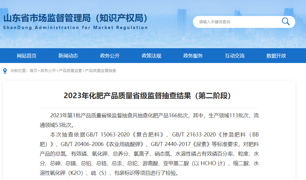 日前,山东省市场监督管理局公布了2023年化肥产品质量省级监督抽查结果(第二阶段)。