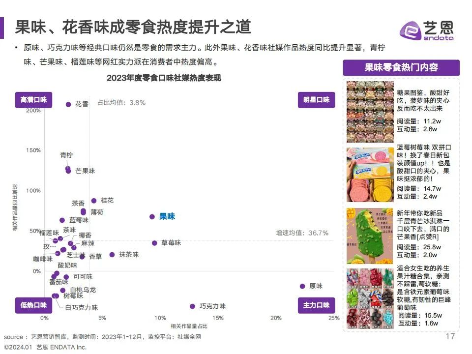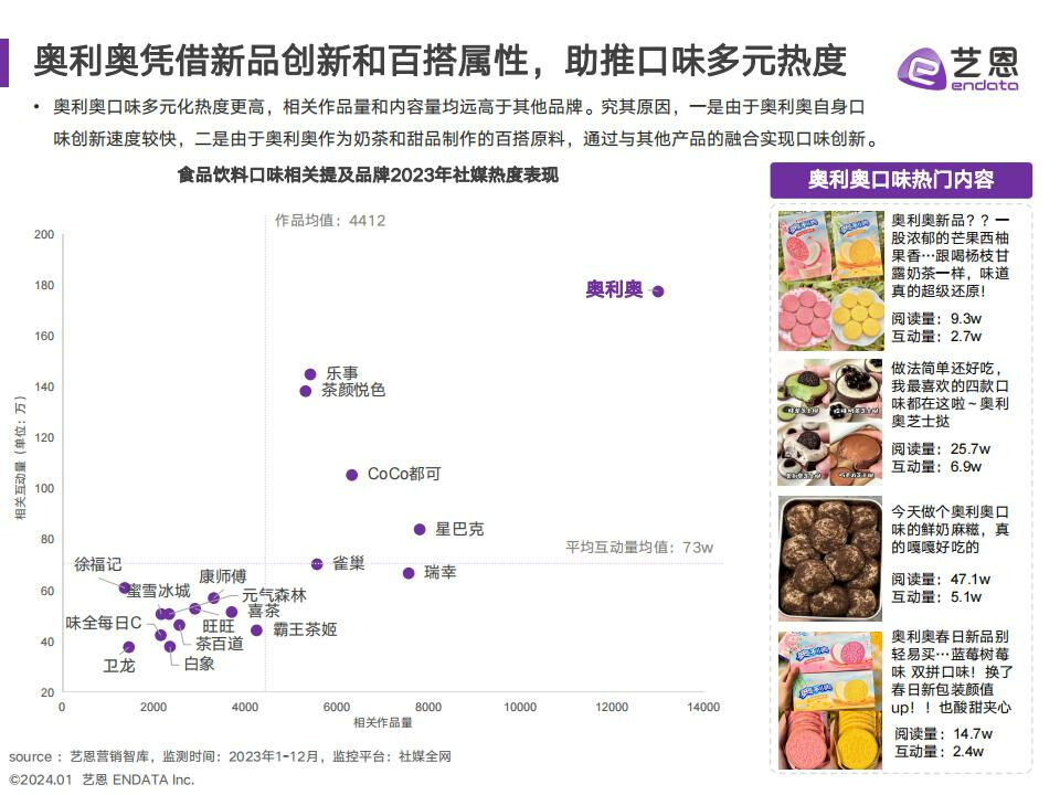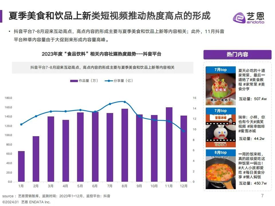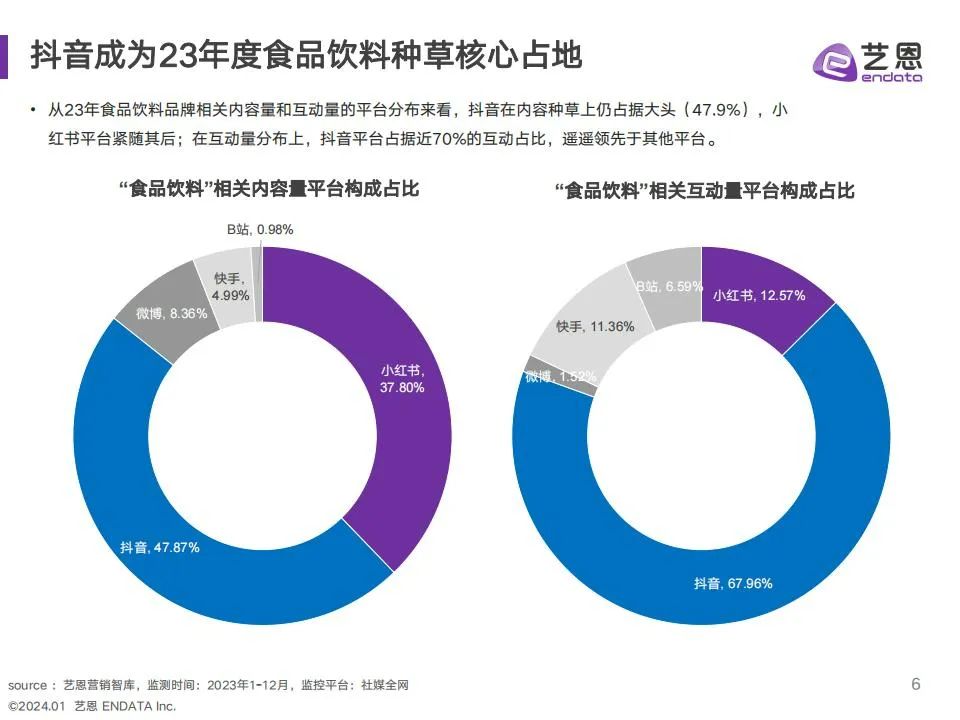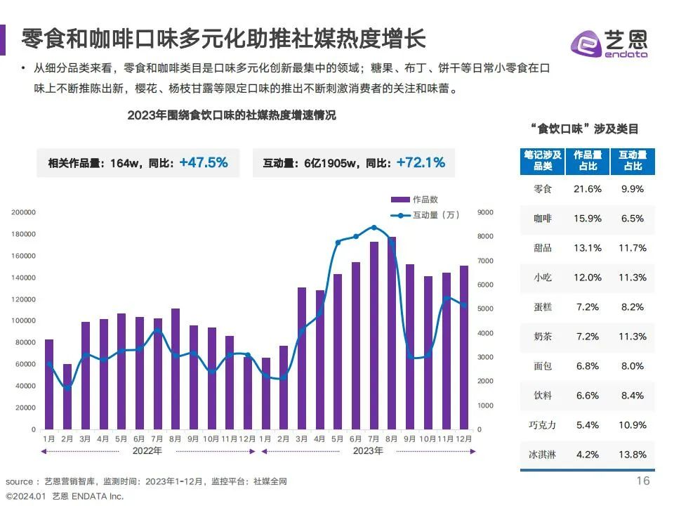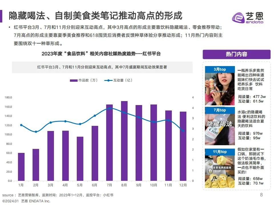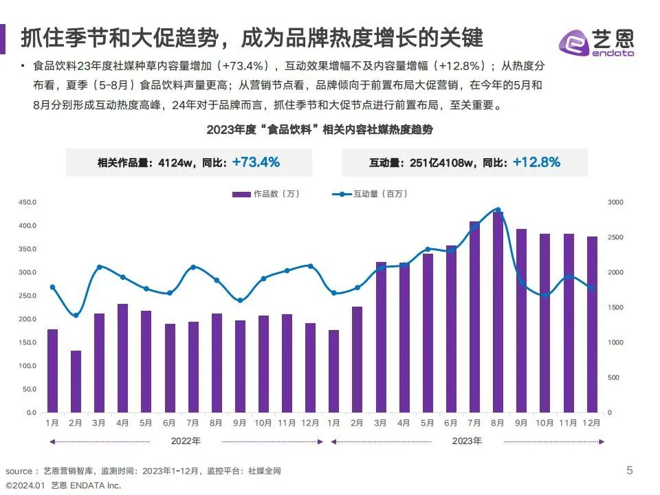 食饮赛道23年度社媒种草内容与互动热度均增加,抓住季节和大促趋势,成为品牌热度增长关键。趋势洞察: