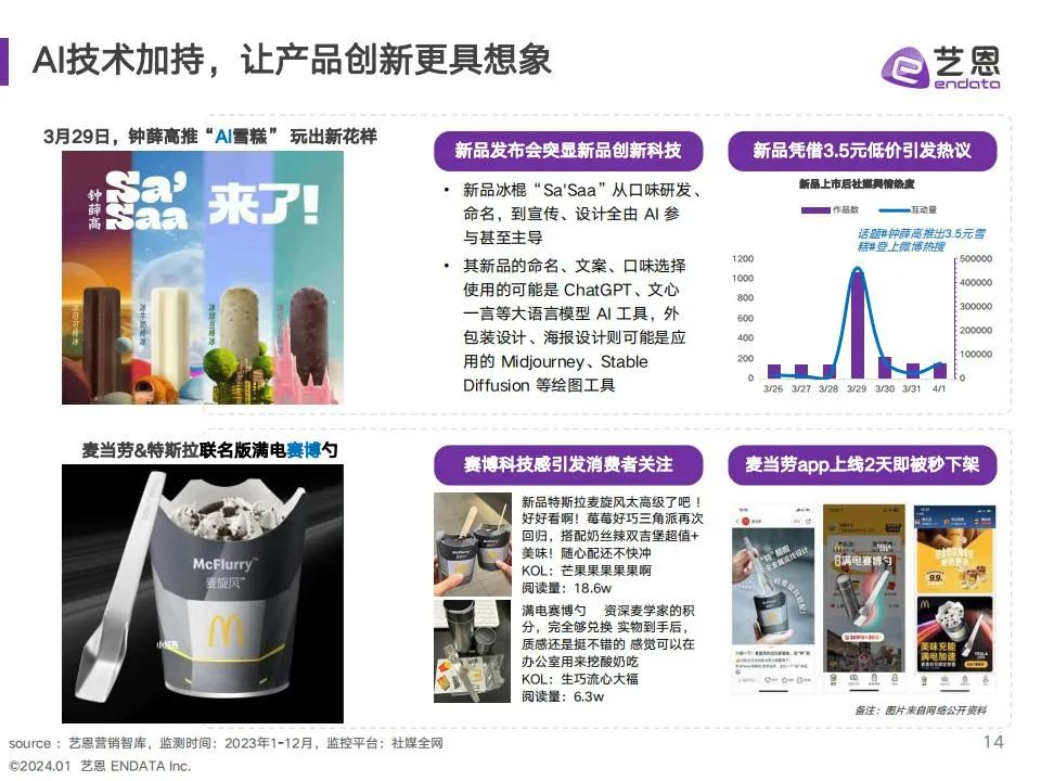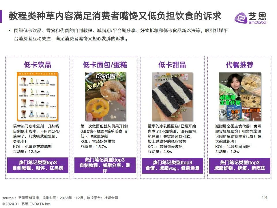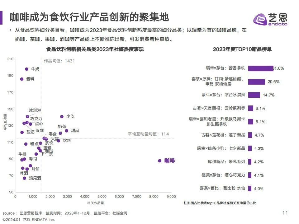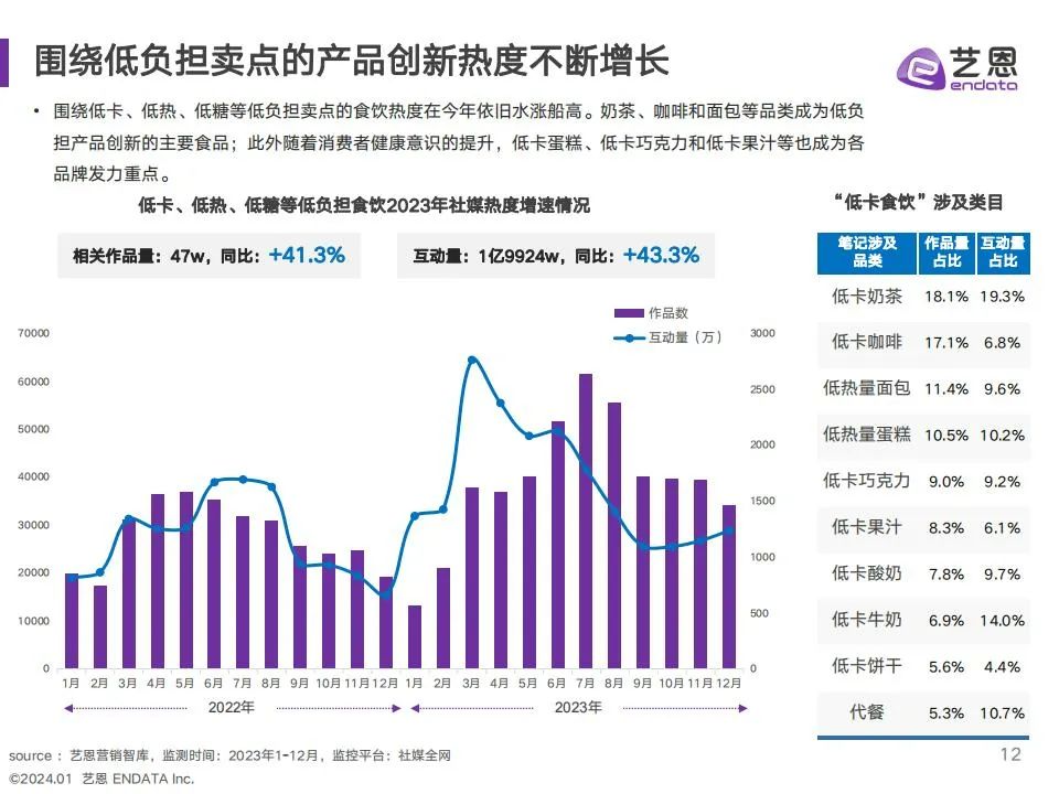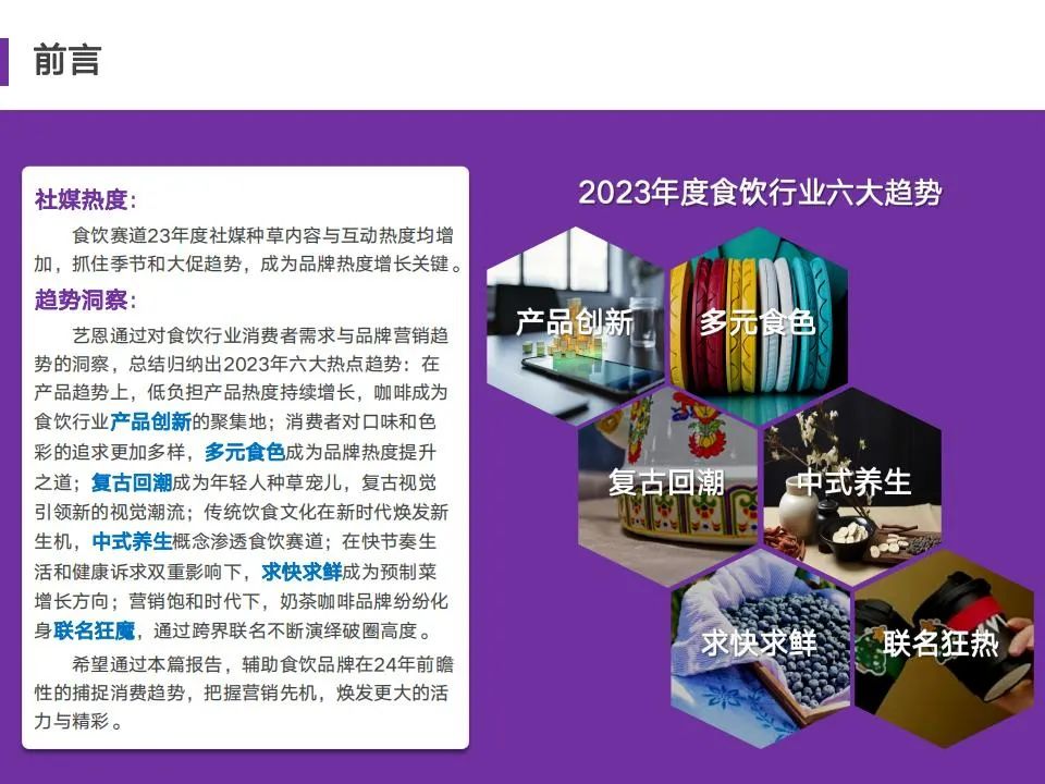 艺恩通过对食饮行业消费者需求与品牌营销趋势的洞察,总结归纳出2023年六大热点趋势:在产品趋势上,低负担产品热度持续增长,咖啡成为食饮行业产品创新的聚集地;消费者对口味和色彩的追求更加多样,多元食色成为品牌热度提升之道;复古回潮成为年轻人种草宠儿,复古视觉引领新的视觉潮流;传统饮食文化在新时代焕发新生机,中式养生概念渗透食饮赛道;在快节奏生活和健康诉求双重影响下,求快求鲜成为预制菜增长方向;营销饱和时代下,奶茶咖啡品牌纷纷化身联名狂魔,通过跨界联名不断演绎破圈高度。希望通过本篇报告,辅助食饮品牌在24年前瞻性的捕捉消费趋势,把握营销先机,焕发更大的活力与精彩。