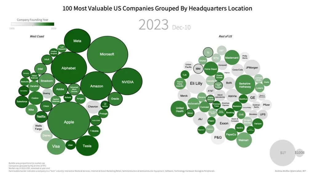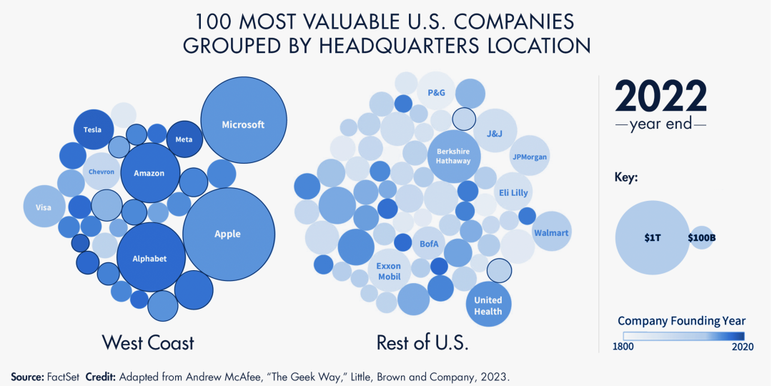 但是,即使是行情这么惨淡,到了2022年底,西海岸的公司市值(占47%)几乎与全美国其他地区(占53%)持平。