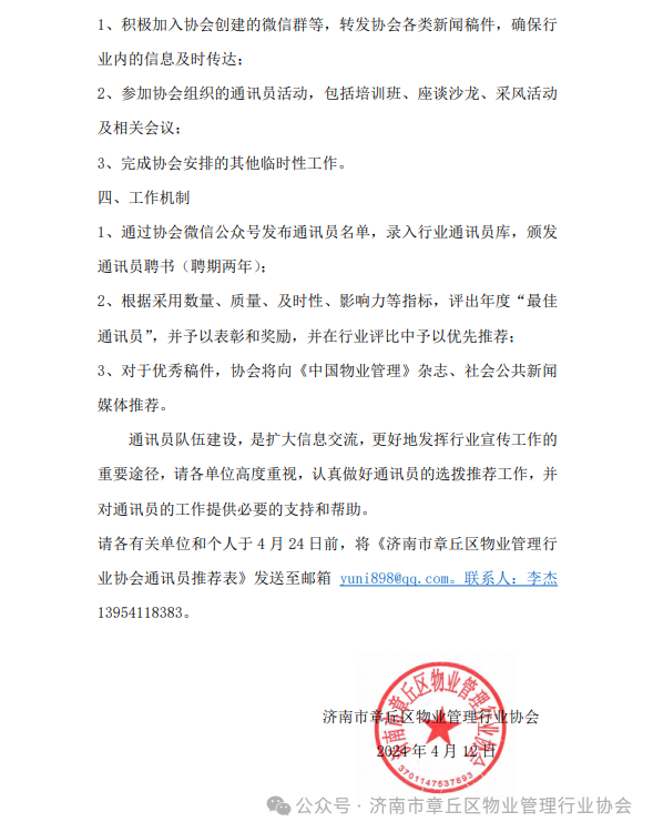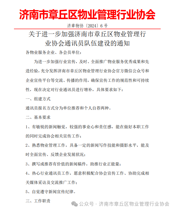 关于进一步加强济南市章丘区物业管理行业协会通讯员队伍建设的通知
