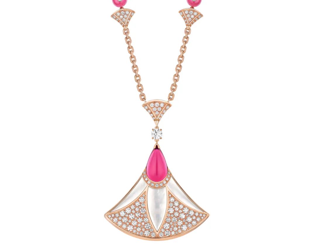 DIVAS’ DREAM系列18K玫瑰金项链精妙诠释欢愉女性魅力,以璀璨多彩的设计演绎标志性扇形图案。此系列的标志性美学元素点缀密镶钻石和珍珠母贝嵌饰,经过精心切割以契合精密复杂的设计,而一颗梨形红碧玺优雅缀于宝石马赛克图案之上,将宝格丽对罗马文化的传承体现得淋漓尽致。