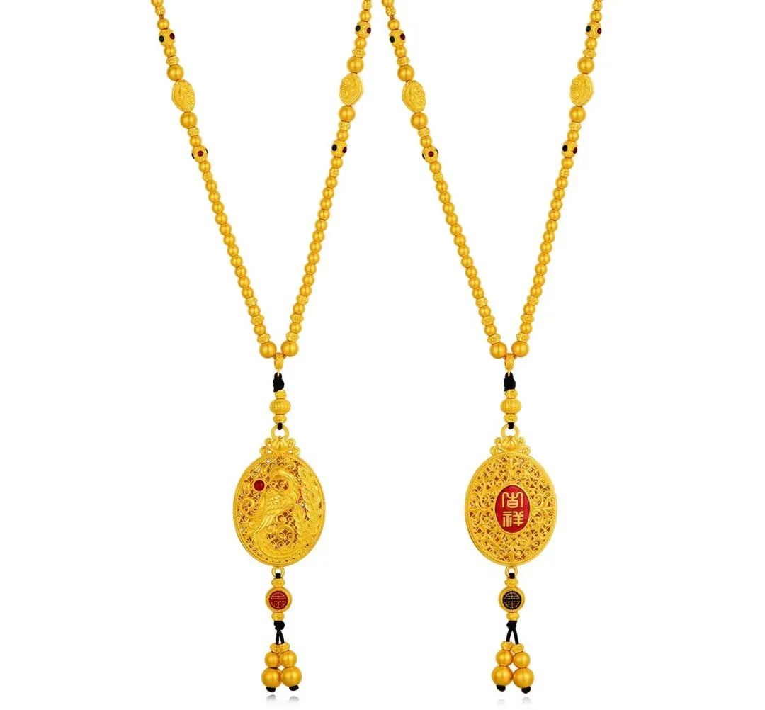 链身的连珠纹蕴含圆满,如意连绵之意,垂珠采用凤羽纹,寓意生活美满,万事吉祥。