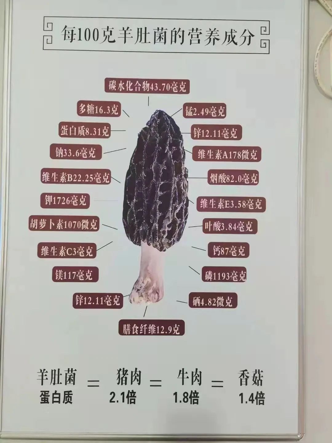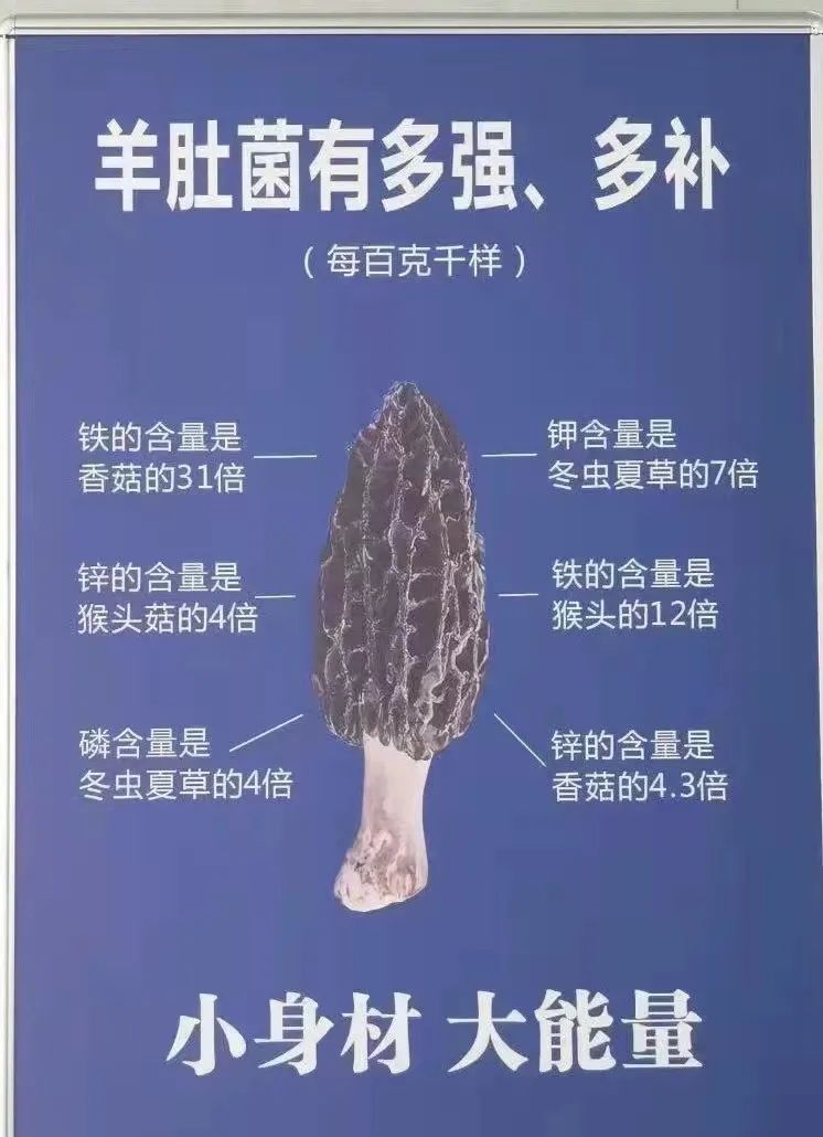 羊肚菌在自然界中,其营养成份仅次于冬虫夏草,素有菌中之王的叫法。据测,羊肚菌含粗蛋白20%、粗脂肪26%、碳水化合物38.1%,还含有人体必需的7种氨基酸,同时还含有大量人体必需的矿物质,每百克干品中钾、磷含量是冬虫夏草的7倍和4倍,锌的含量是香菇的4.3倍,铁的含量是香菇的31倍,猴头菇的12倍等,有着“素中之荤”的美称。