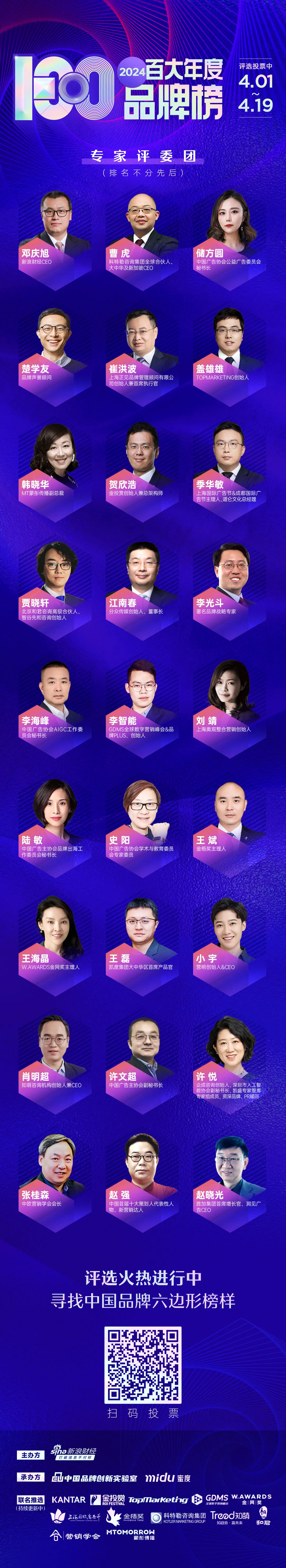 由新浪财经携手中国品牌创新实验室、蜜度联合打造的2024百大年度品牌榜暨十大品牌人物评选重磅来袭。该榜单将聚焦中国品牌在过去一年的亮眼表现,由中欧营销学会为学术指导,联合凯度KANTAR组委会、金投赏组委会、上海国际广告节组委会、GDMS&VCON星创奖组委会、金触点奖组委会、金梧奖组委会、金网奖组委会等知名行业评选机构及科特勒咨询集团、知萌咨询、和君、MT蒙彤传播等知名咨询营销机构,依据“传播度、亲密度、美誉度、社会责任、关键沟通、资本品牌”六大维度,最终将综合网络投票、新浪财经品牌价值模型评分以及评委会终评结果,分别遴选出100个在过去一年中表现优异的品牌,年度品牌营销案例TOP50并遴选出十位卓越的中国品牌人和十大优秀代理商。评选希望在关注品牌亮眼发展的同时,鼓舞提振背后日夜付出的无数品牌人物和机构,见证民族品牌蜕变、助力行业发展,传递年度品牌榜样力量。