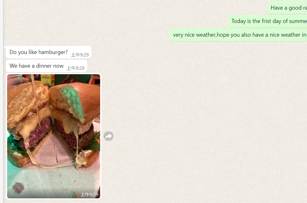 然后客户回答说“大部分是的,但他不是”,巴拉巴拉,说得开心了,拍了一张食物的照片,说他正在吃汉堡,你喜不喜欢汉堡诸如此类。