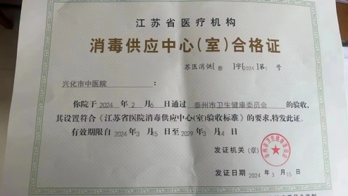 春风有信,花开有期,所有美好已在路上。在各级领导的关心支持和兄弟单位专家的指导帮助和供应室全体成员的共同努力下,兴化市中医院消毒供应室终于顺利通过泰州市卫健委组织的评审验收,达到了《江苏省医院消毒供应中心(室)验收评价标准》,取得江苏省医疗机构消毒供应中心合格证。