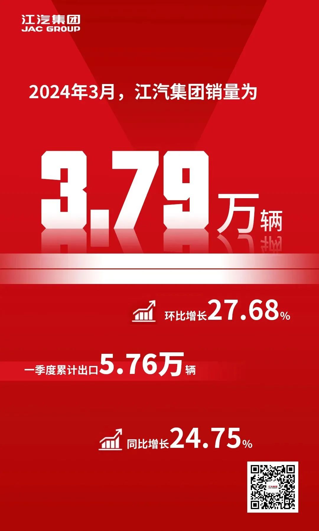 2024年4月9日, 江汽集团发布《安徽江淮汽车集团股份有限公司2024年3月产、销快报》(下称“公告”)。公告显示:2024年3月,江汽集团销量为3.79万辆,环比增长27.68%;乘用车领域,3月,多功能乘用车(MPV)销量环比增长62%;SUV和轿车销量分别环比增长10.17%与38.07%;新能源乘用车3月销量环比增长63.9%,同比增长106.35%,一季度累计销量同比增长49.19%。商用车领域,3月销量环比增长27.55%,一季度,江淮1卡帅铃累计销量同比增长26.98%;江淮康铃累计销量同比增长超30%;江淮威铃累计销量同比增长超50%。