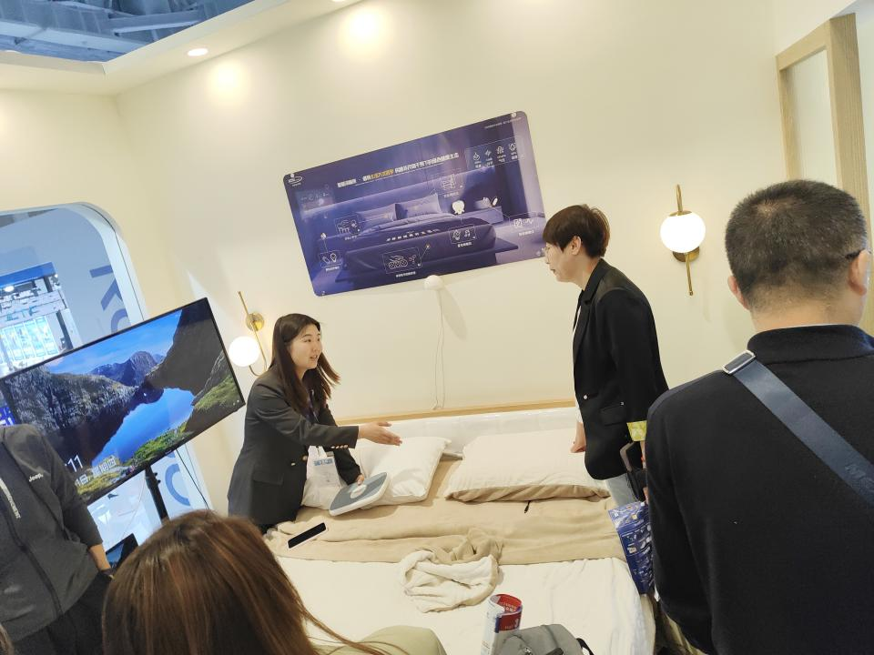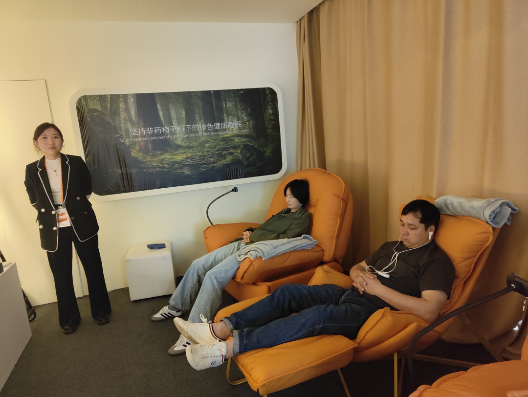 希迪克二层展台为数字睡眠空间站体验区,包含居家智慧深睡房和沉浸式睡眠疗愈室两个空间,配备智能睡眠枕、智能止鼾枕、体感音乐助眠床垫、智能睡眠仪、额贴式舒睡仪、星空助眠灯、助眠香薰等智慧睡眠产品,通过一键连接梦享佳APP,实现设备物联,全方位监测睡眠状况,让睡眠过程可视化,打造集睡眠监测与干预、睡眠环境改善等一站式的智慧睡眠新体验,现场体验者络绎不绝,好评如潮,对希迪克的多款睡眠“黑科技”产品表现出了浓厚的兴趣,体验后纷纷表示“很久没有这么舒服的睡上一觉了”。