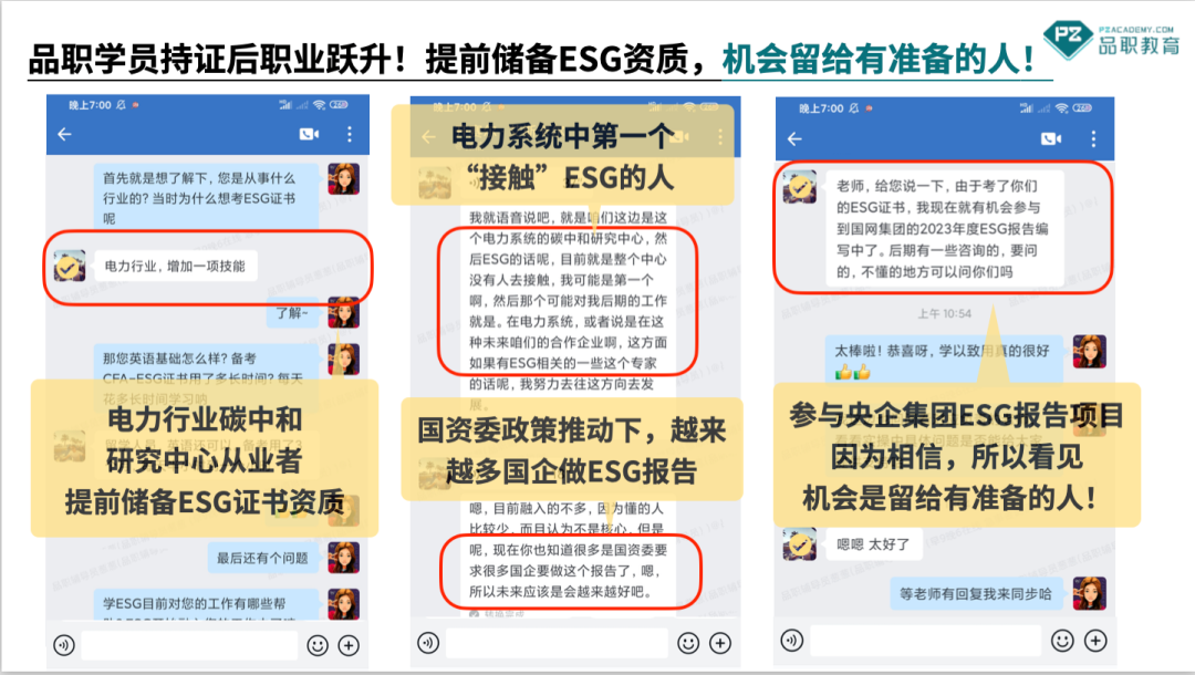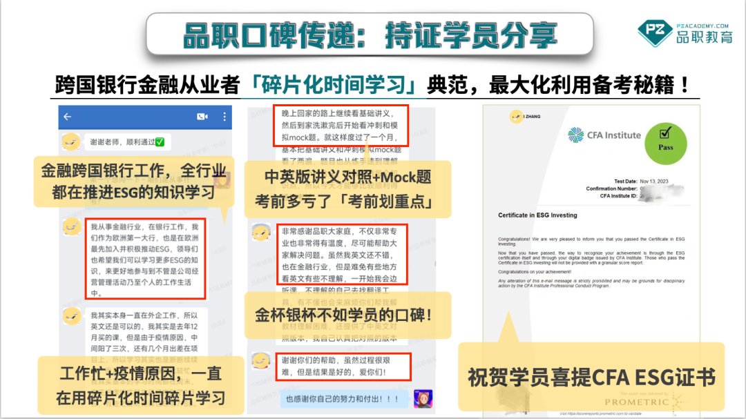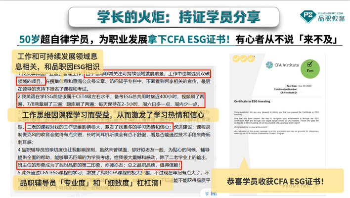 我们品职还有一位从事基金管理的50岁超自律学员,由于自身工作和可持续发展领域息息相关,而后报名了品职的ESG课程,ta表示,自己的工作思维都因ESG课程学习而受益,激发了自己更多的学习热情和信心!