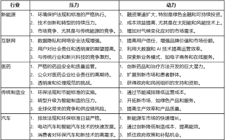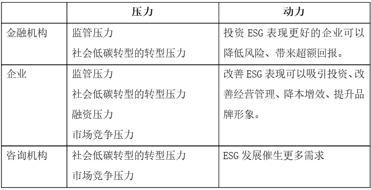 ESG压力主要由于监管的要求或行业的竞争,企业如果不做ESG就会面临违规、失去市场等风险; ESG动力主要来自于企业开展ESG工作,会为企业带来新的增长点或提升竞争力。