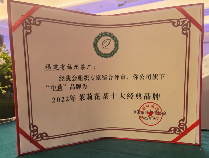福州茶厂“中莉”荣获2022年中国茉莉花茶十大经典品牌称号。