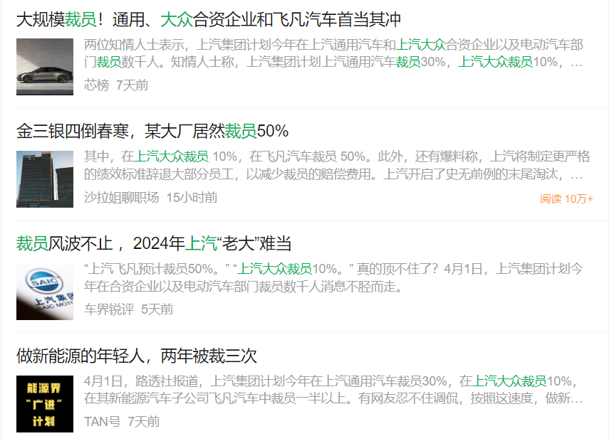 具体来说,上汽大众可能要有10%的员工要面临被裁的风险,而上汽通用的情况可能更糟,据说裁员比例可能高达30%。最让人揪心的是,飞凡汽车,这家上汽旗下的电动车子公司,可能会有超过一半的员工要离开。想想看,这可是咱们国内汽车行业的风向标啊,这样的变动无疑给整个行业带来了不小的震动。