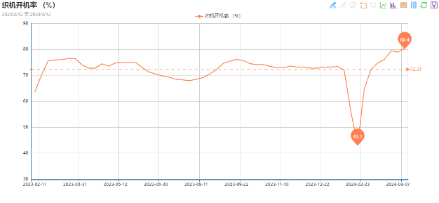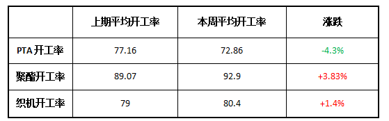 开工率方面,PTA平均开工率在72.86%,较上周下降4.3%;聚酯方面,聚酯平均负荷为92.9%,较上周上升3.83%。因为订单持续下达的原因,本周织机开机略有回升,在80.4%左右。