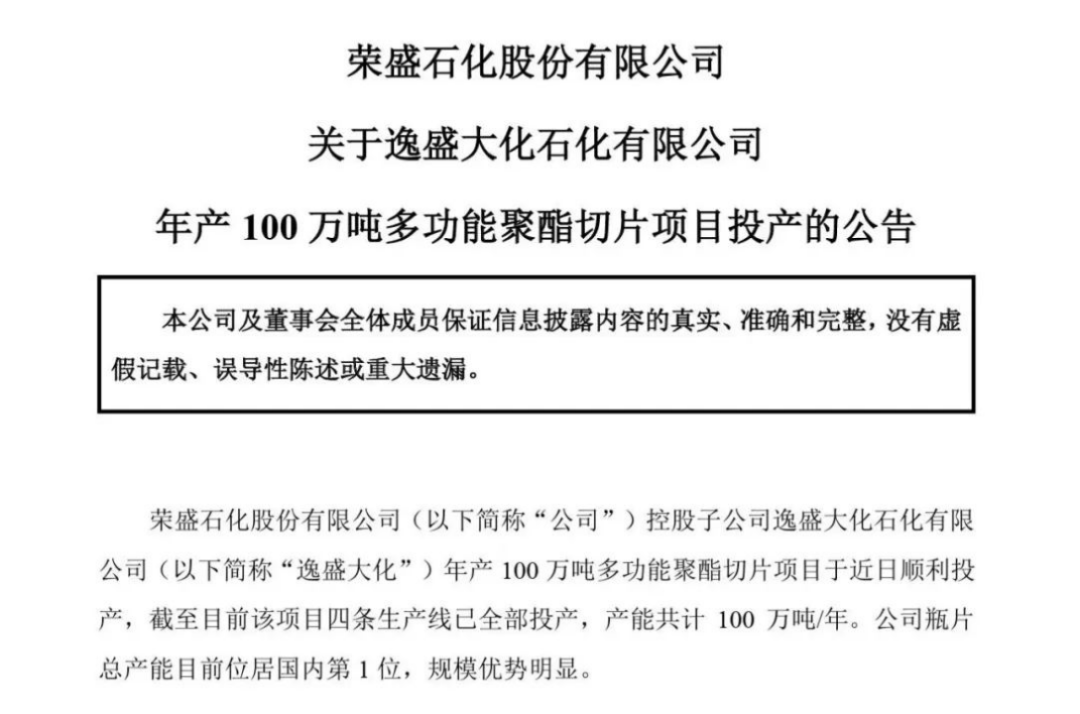 4月2日,荣盛石化股份有限公司发布关于逸盛大化石化有限公司年产100万吨多功能聚酯切片项目投产的公告:截至目前该项目四条生产线已全部投产,产能共计100万吨/年。公司瓶片总产能目前位居国内第1位。