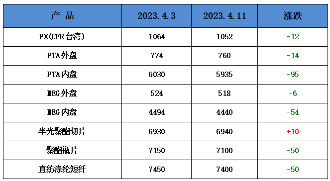聚酯方面:本周国际小幅回落。由于市场对中东紧张局势的担忧出现缓解和通胀对市场需求影响引起担忧,国际原油期货价格在近期市场由涨转跌。截至4月11日收盘,纽约商品交易所5月交货的轻质原油期货价格下跌1.19美元,收于每桶85.02美元,跌幅为1.38%;6月交货的伦敦布伦特原油期货价格下跌74美分,收于每桶89.74美元,跌幅为0.82%。