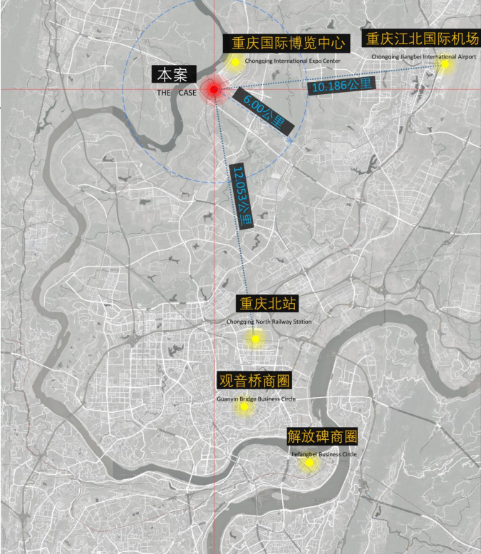悦来汇项目坐落于重庆国际博览中心南侧,悦来大道与顺悦路交汇处,周围由多条干道、轨道、跨江大桥构成了立体交通系统,项目距离轨道6号线高义口站仅800米,距离江北国际机场直线距离约12公里,交通可达性强。项目位于悦来生态城区域,与张家溪湿地公园无缝连接,北临嘉陵江、悦来滨江公园,生态资源十分丰富。