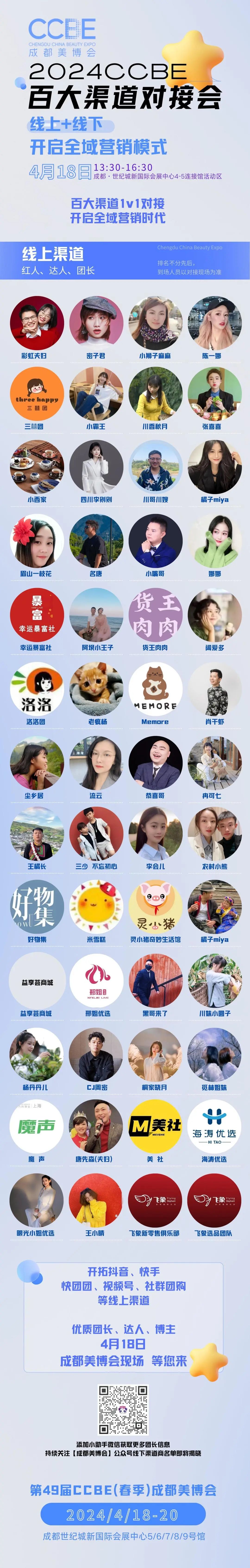 为助力美业品牌开启全域营销,本届成都美博会同步策划举办2024CCBE百大渠道对接会,聚集快团团等私域大V团长、抖音博主、快手达人、视频号红人及主播等线上渠道商,助力美业人开拓公私域流量变现;更有来自大西南地区的优质代理商、经销商、连锁机构等线下渠道商,助力美业人打开CS、商超、连锁门店等终端市场。