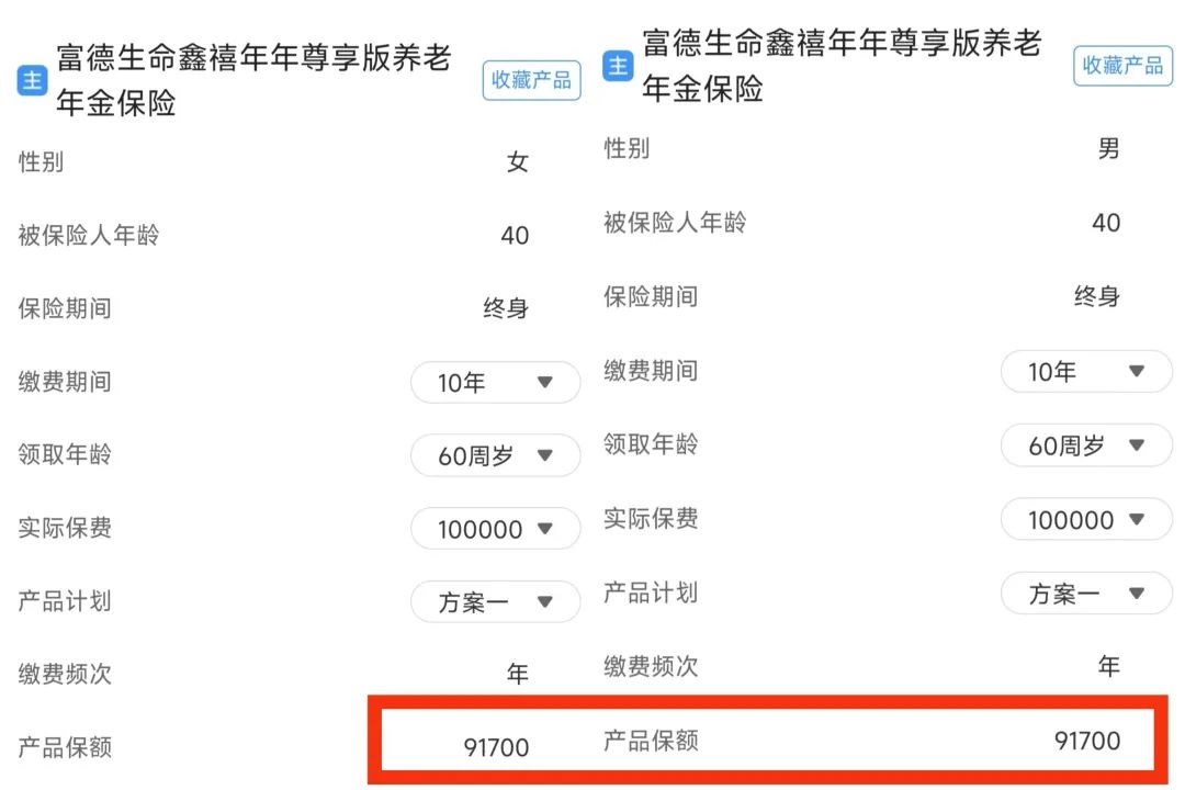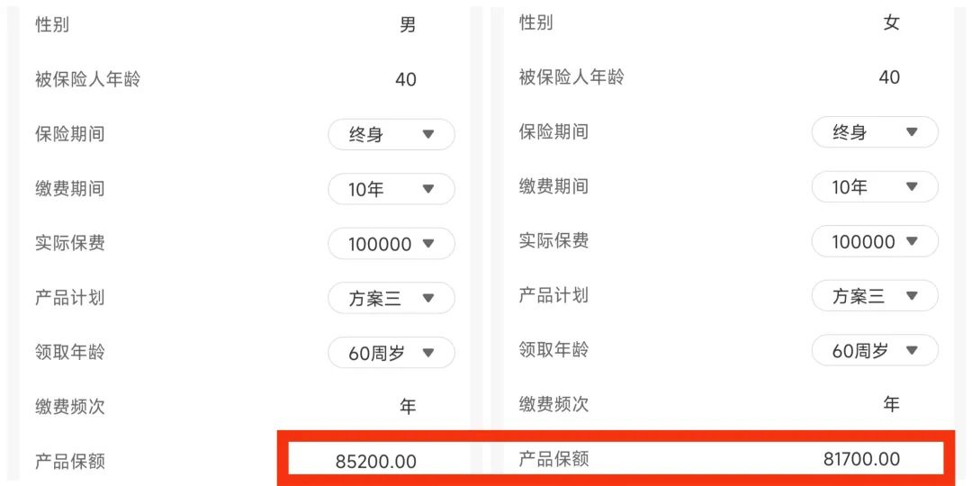 女性平均寿命比男性长,所以同样年纪同样保费,男性领的钱比女性多。