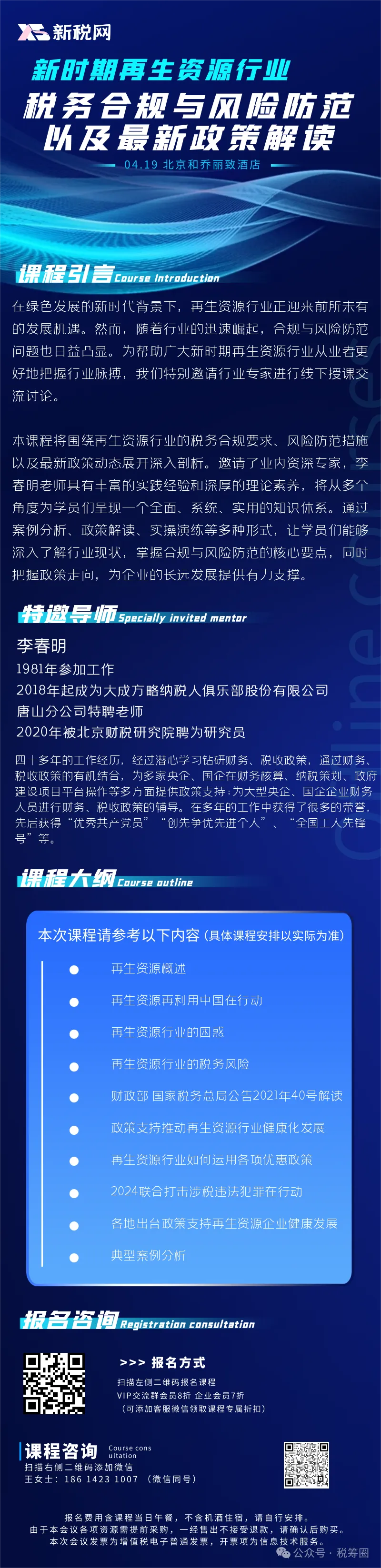 为帮助广大新时期再生资源行业从业者更好地抓住行业机遇、把握行业脉搏,4月19日(下周五),我们特别邀请到行业专家于北京和乔丽致酒店进行线下授课交流讨论。