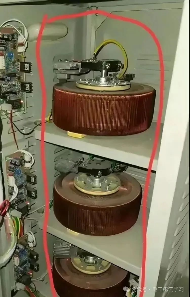 于是小编翻阅大量资料及同行评论,才知道配电柜里面有3个圆盘是三相自耦调压变压器。一般用在电压不稳的交流电路中,把电压稳定在额定电压的使用范围内,保证电器的正常运行。