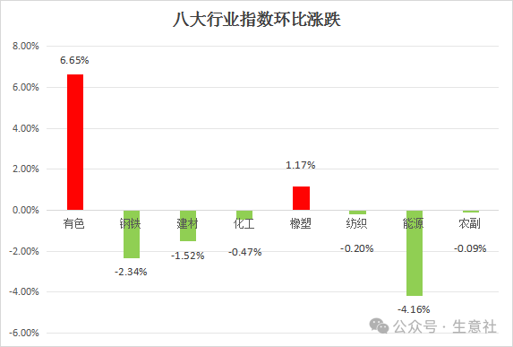 生意社监测的8个行业,本周涨多跌少,上涨前三的分别是有色行业,涨幅为2.24%,钢铁行业,涨幅为1.70%,建材行业,涨幅为1.36%;下跌的是农副行业,跌幅为-1.11%,能源行业,跌幅为-0.41%,纺织行业,跌幅为-0.10%。