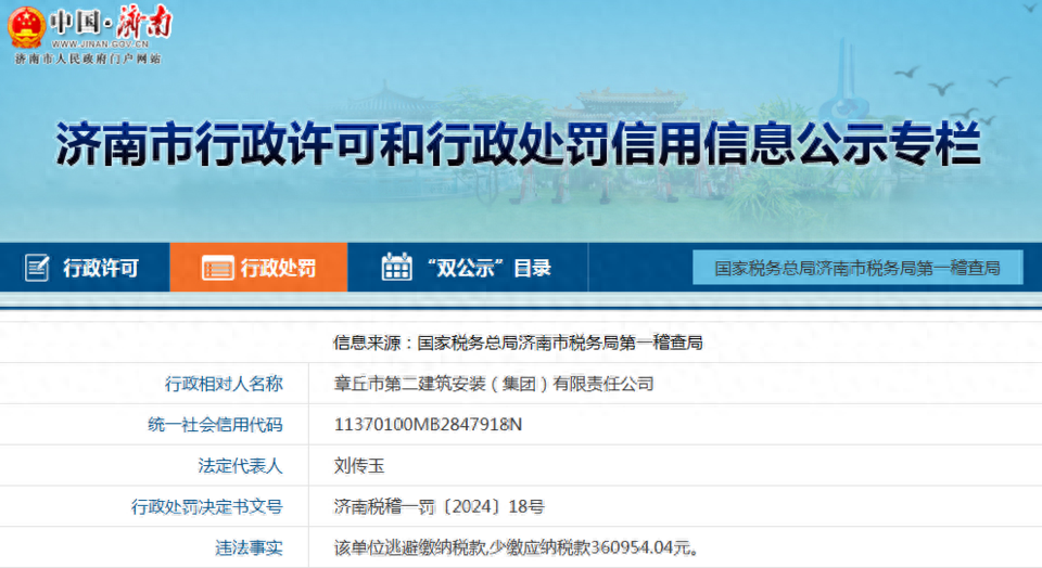 近日,济南市行政许可和行政处罚信用信息公示专栏显示,章丘市第二建筑安装(集团)有限责任公司(下称“章丘二建安装公司”)被罚,原因为“逃避缴纳税款”。