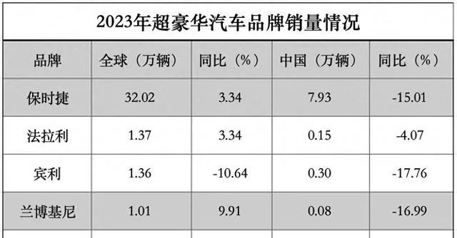 超豪华汽车品牌发布2023年销量情况,包括宾利、法拉利、兰博基尼、保时捷和劳斯莱斯等品牌。