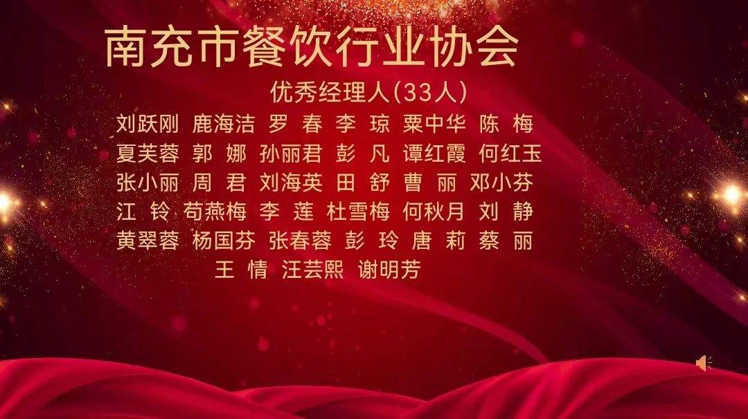 2023年优秀经理人奖(33人)、2023年优秀厨师长奖(32人)、南充餐饮人十五年功勋成就奖(19人)名单: