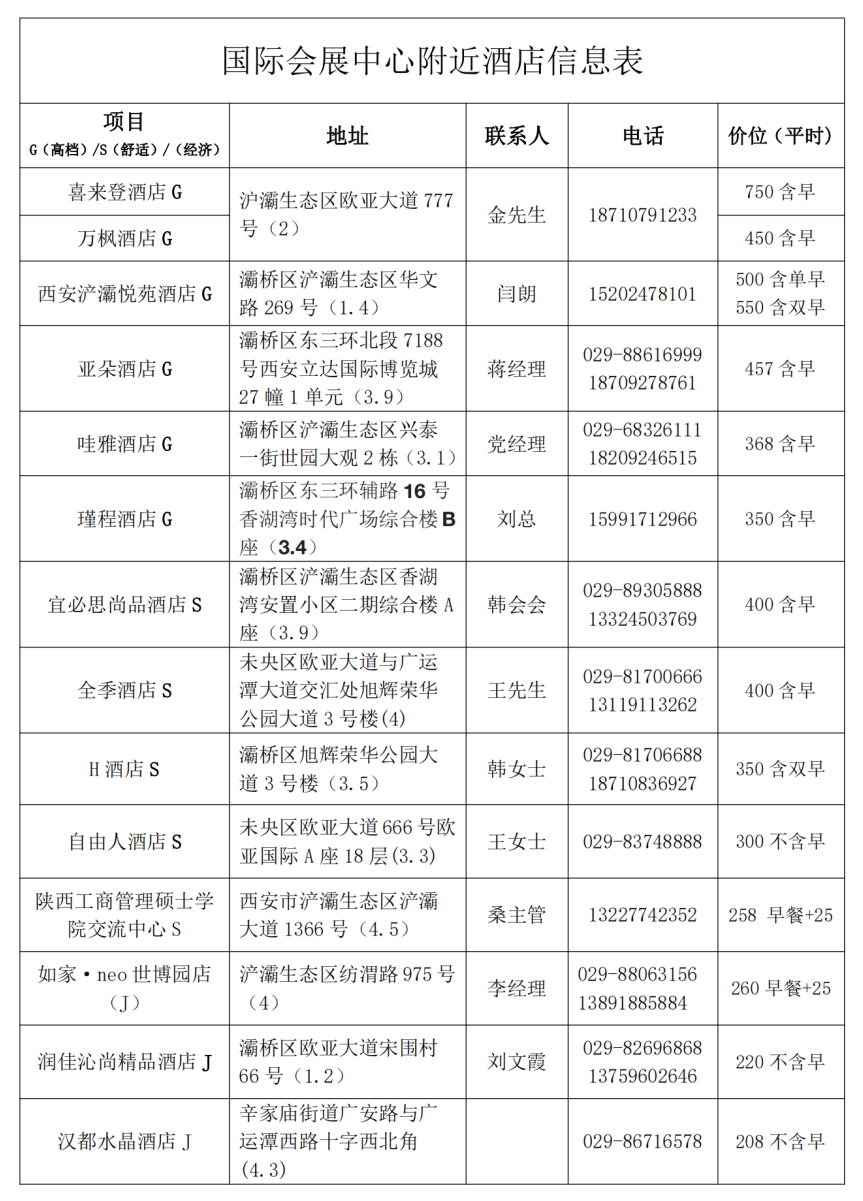 西安5月份属旅游旺季,需要住宿的展商请提前预定酒店,组委会为您推荐展馆周边酒店如下,请参考。如计划住市区,可预定西安地铁3号线沿线,展馆交通较方便。