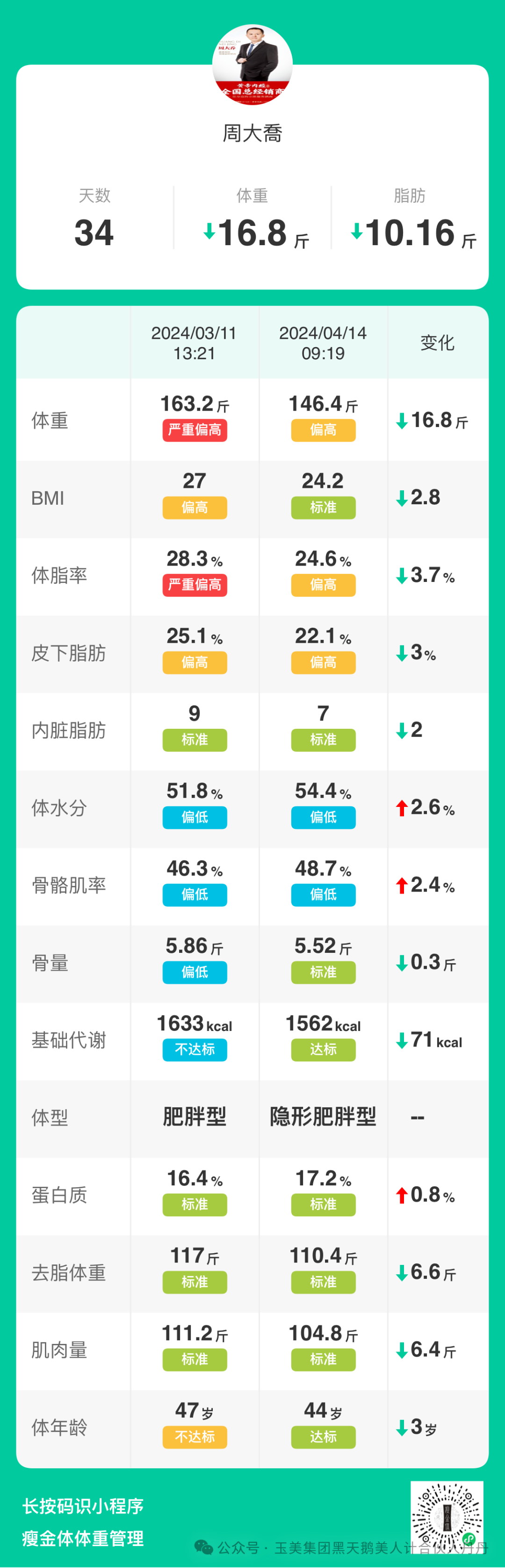 減脂34天,圖一是我的成效,按照圖二執行,圖三我今天健康早餐,圖四是近期對比圖,一步步讓體脂健康無負擔地減少了,努力完成我的目標140斤,距離目標倒數6.4斤,繼續加油吧