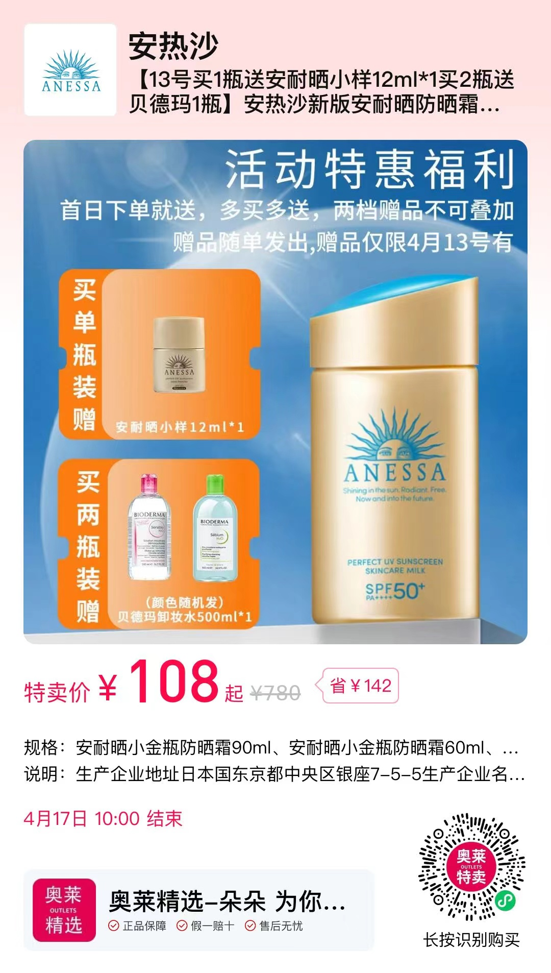 ✅【13号买1瓶送安耐晒小样12ml*1买2瓶送贝德玛1瓶】安热沙新版安耐晒防晒霜