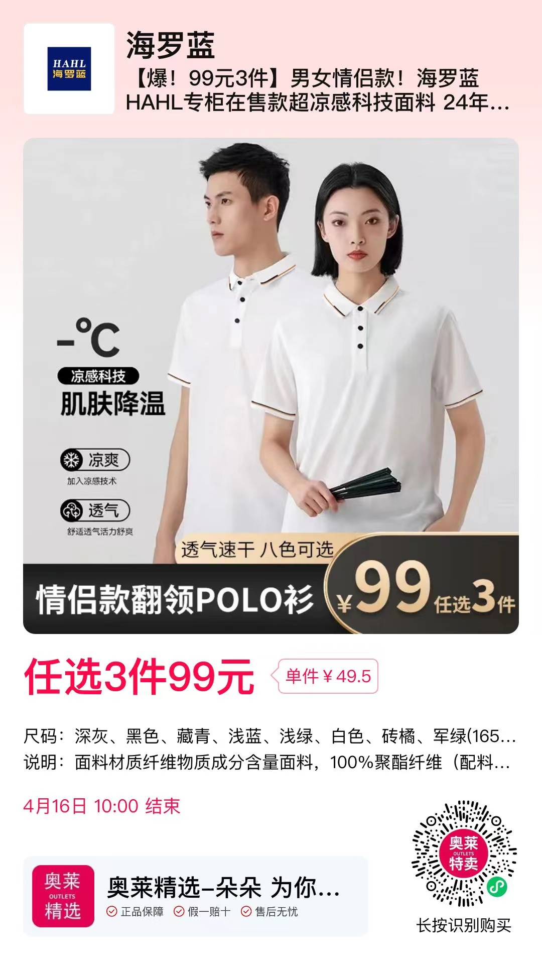 ✅【爆!99元3件】男女情侣款!海罗蓝HAHL专柜在售款超凉感科技面料
