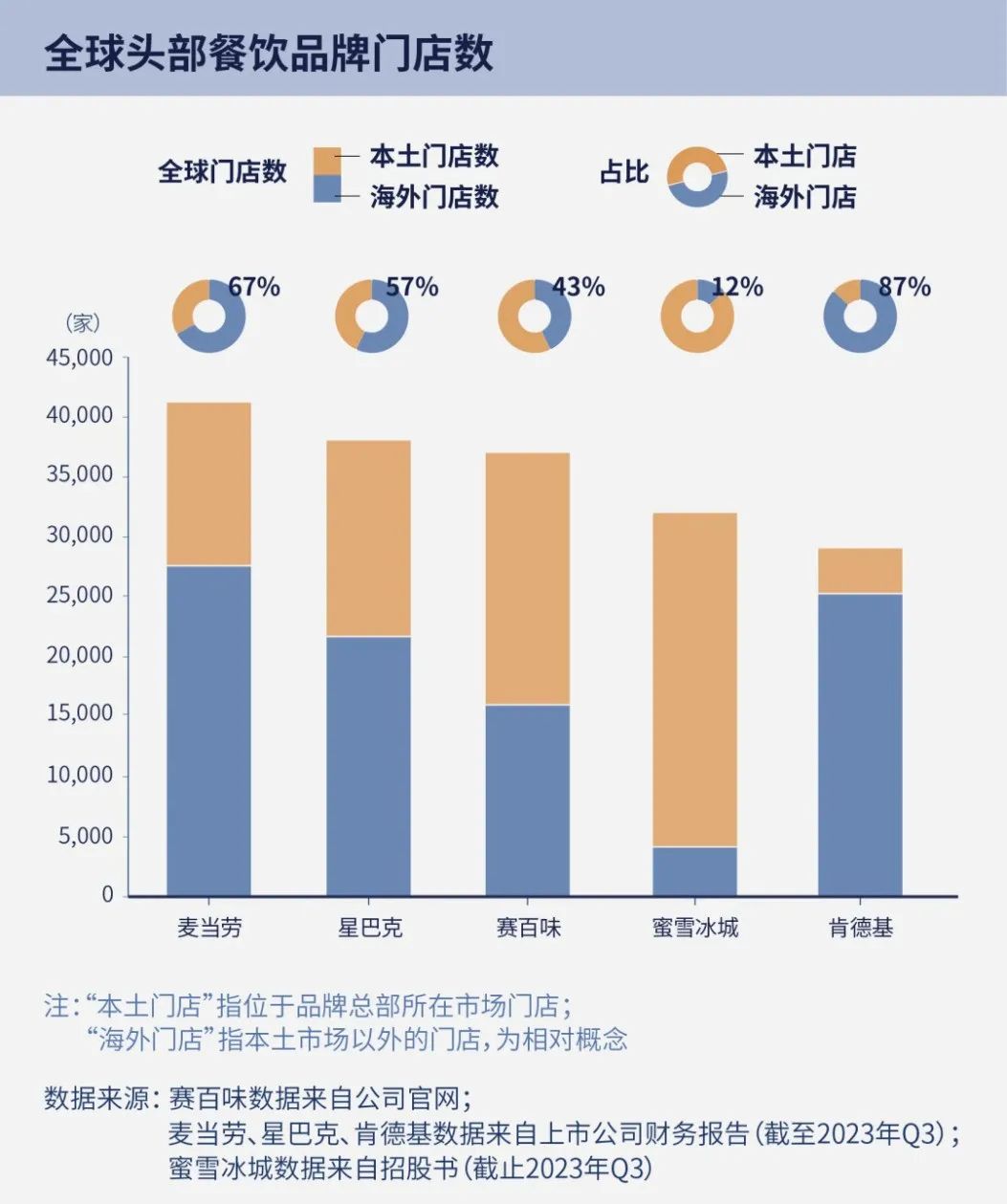 从全球头部的餐饮门店数量布局来看,全球5大连锁品牌中,海外的门店数量超过本国门店数量的,最高的是肯德基,在美国之外有87%的门店,最低的是我们的蜜雪冰城,海外门店数量仅占总门店数的12%;