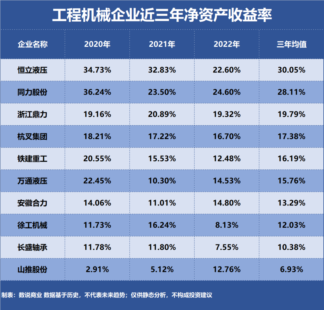 盈利能力:净资产收益率12.03%,毛利率17.84%,净利率5.45%主营产品:土方机械为最主要收入来源,收入占比25.35%,毛利率28.83%公司亮点:徐工机械自主研制了全球首创最大起重能力达88000吨米的履带起重机。盈利能力:净资产收益率16.19%,毛利率33.61%,净利率19.03%主营产品:隧道掘进机为最主要收入来源,收入占比49.70%,毛利率36.91%公司亮点:铁建重工主营业务是隧道掘进机、轨道交通设备和特种专业装备。盈利能力:净资产收益率6.93%,毛利率14.39%,净利率3.21%主营产品:工程机械主机产品为最主要收入来源,收入占比64.18%,毛利率23.18%公司亮点:山推股份主要产品是以推土机、配件为主的工业产品和以挖掘机为主的商业产品。盈利能力:净资产收益率10.38%,毛利率30.95%,净利率15.85%主营产品:金属塑料聚合物自润滑卷制轴承为最主要收入来源,收入占比29.66%,毛利率49.16%公司亮点:长盛轴承主营业务是自润滑轴承的研发、生产和销售。盈利能力:净资产收益率30.05%,毛利率42.89%,净利率28.81%主营产品:液压油缸为最主要收入来源,收入占比55.93%,毛利率40.10%公司亮点:恒立液压的挖掘机专用油缸产品市场占有率达50%以上,公司单独设计、制造的液压测试台亦是行业领先。盈利能力:净资产收益率13.29%,毛利率16.94%,净利率6.05%主营产品:叉车及配件为最主要收入来源,收入占比99.06%,毛利率20.36%公司亮点:安徽合力主营业务以工业车辆整机、零部件、智慧物流与工业互联网、后市场为核心。盈利能力:净资产收益率15.76%,毛利率26.07%,净利率14.75%主营产品:机械装备用缸为最主要收入来源,收入占比71.17%,毛利率20.26%公司亮点:万通液压主要产品包括自卸车专用油缸、机械装备用油缸、油气弹簧。盈利能力:净资产收益率19.79%,毛利率31.76%,净利率21.15%主营产品:剪叉式高空作业平台为最主要收入来源,收入占比60.51%,毛利率32.63%公司亮点:浙江鼎力主要产品有直臂式、曲臂式、剪叉式、铝合金桅柱式、桅杆攀爬式高空作业平台和高空取料机等。盈利能力:净资产收益率17.38%,毛利率17.88%,净利率7.46%主营产品:叉车及配件为最主要收入来源,收入占比94.79%,毛利率18.15%公司亮点:杭叉集团主营业务是叉车、仓储车、牵引车、无人驾驶叉车(AGV)等工业车辆、高空作业车辆、强夯机、清洁设备等。盈利能力:净资产收益率28.11%,毛利率20.34%,净利率10.23%主营产品:整车-宽体自卸车为最主要收入来源,收入占比92.95%,毛利率22.07%公司亮点:同力股份主营业务为各类矿山开采及大型工程物料运输所需的非公路宽体自卸车、坑道车、洒水车等。工程机械盈利能力前十企业,近三年净资产收益率、毛利率、净利率: