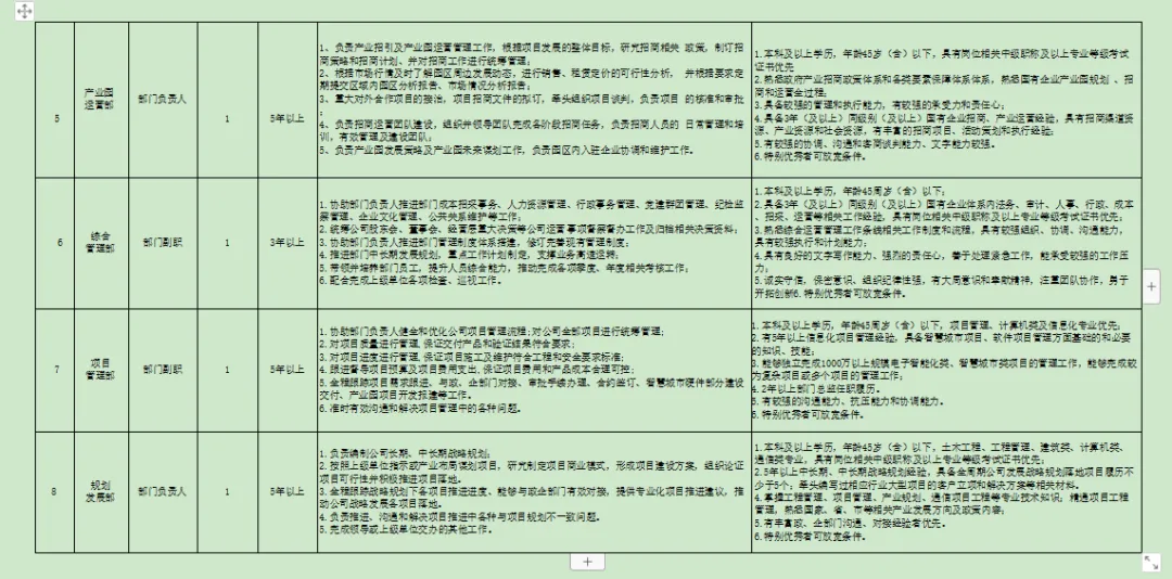 根据业务发展需求评估,拟招聘如下紧缺专业人员:工程建设部部门负责人1名、部门副职1名;财务管理部部门负责人1名、部门副职1名;产业园运营部部门负责人1名;综合管理部部门副职1名;项目管理部部门副职1名;规划发展部部门负责人1名。