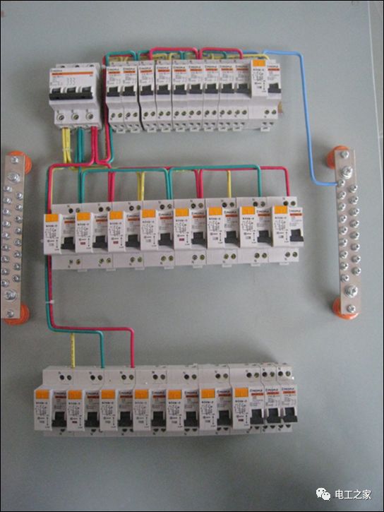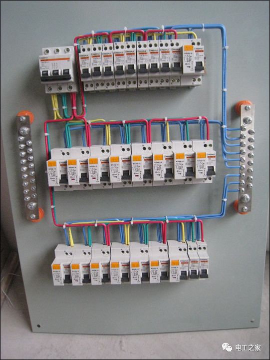 4、箱体内总空开与各分空开之间配线一般走左边,配电箱出线一般走右则。