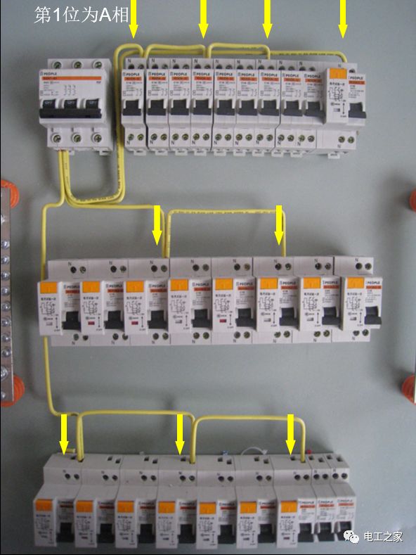有黄色的箭头可以看出总空开下控制下的分空开按照第一排算起1、4、7、10、13、16、19、21、24、27为A相空开的位置,空开所连接的相线导线的颜色均采用黄色