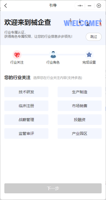 在登录械企查2.0时通过设置您的关注内容(例如技术研发、生产制造、临床注册、市场销售、战略管理、投融资、监管评审等),以及您的身份(例如生产厂家、经销商、金融机构、医疗机构、政府机构、行业协会、服务机构、产业园区等),根据您选择的特定身份角色由系统进行相关数据的自动推荐,医械行业信息获取快人一步。