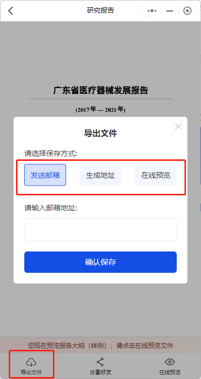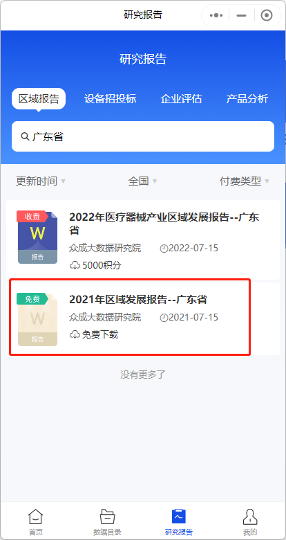 此外,械企查2.0还提供医疗器械行业区域报告、设备招投标、企业评估、产品分析四类报告,可根据更新时间、区域、产品线、分类目录等不同维度查询, 还将不定期遴选部分报告免费提供,可支持免费导出,如“2021年区域发展报告——广东省”报告。