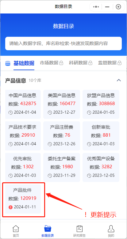 此外,近7天更新内容会出现 “!” 标识提示查阅,如“产品批件”提示。例如在数据目录-基础数据-产品信息库中,可看到产品批件“!”提示 ,点击即可查看更新动态信息,满足医械人精细化、随时查看产品信息的需求。